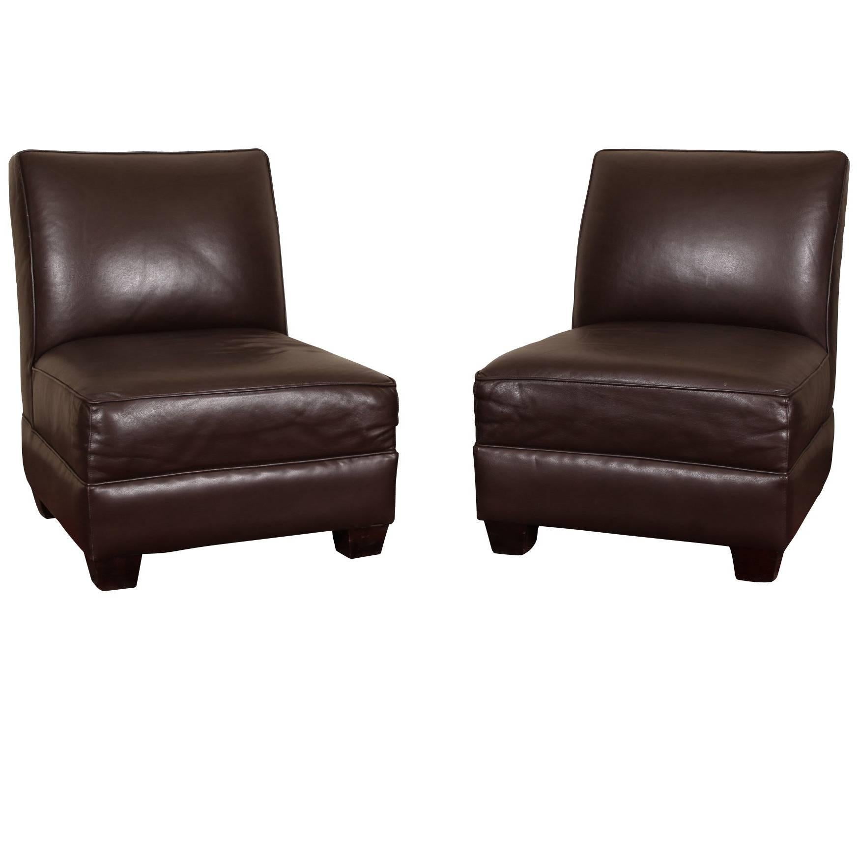 Pair of Chocolate Brown Leather Slipper Chairs For Sale at 1stDibs